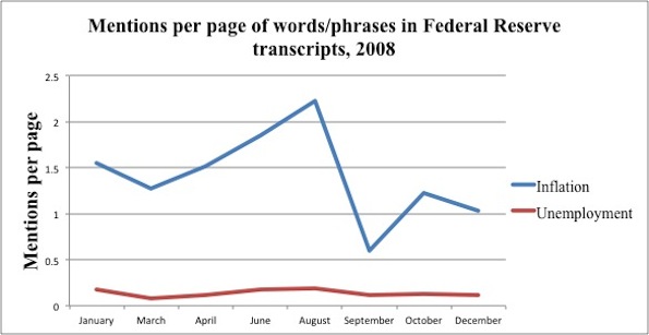 HAVING combed through the Fed transcripts the old-fashioned way, we decided to apply some fancier techniques. We plugged all 1,865 pages of central-bankery into a computer programme and came up with a few extremely informative nuggets. First, there is only one winner in the dual mandate. The word “inflation” (or variants thereof, such as “inflationary”) was mentioned a cool 2,664 times in 2008; “unemployment” pops up just 275 times.