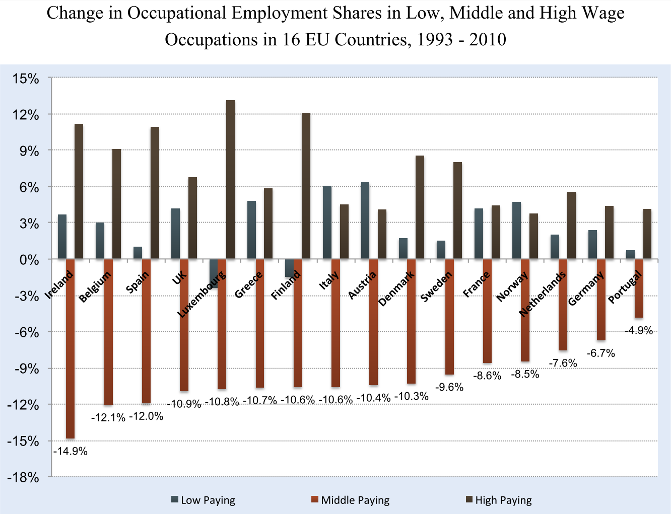 For example, Autor’s paper shows that low-wage jobs like fast food work has been growing rapidly all across the industrialized world and high-wage jobs like investment banking has also been growing. But middle-income jobs have been shrinking.