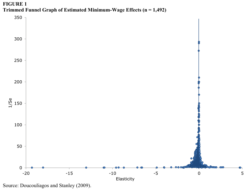 The [meta analysis] suggests the existence of a very small, but statistically significant, negative minimum-wage effect. A 10 per cent increase in the minimum wage reduces employment by about 0.10 per cent (see column 4 of Table 3). But even if this adverse employment effect were true, it would be of no practical relevance. An elasticity of -0.01 has no meaningful policy implications. If correct, the minimum wage could be doubled and cause only a 1 per cent decrease in teenage employment.