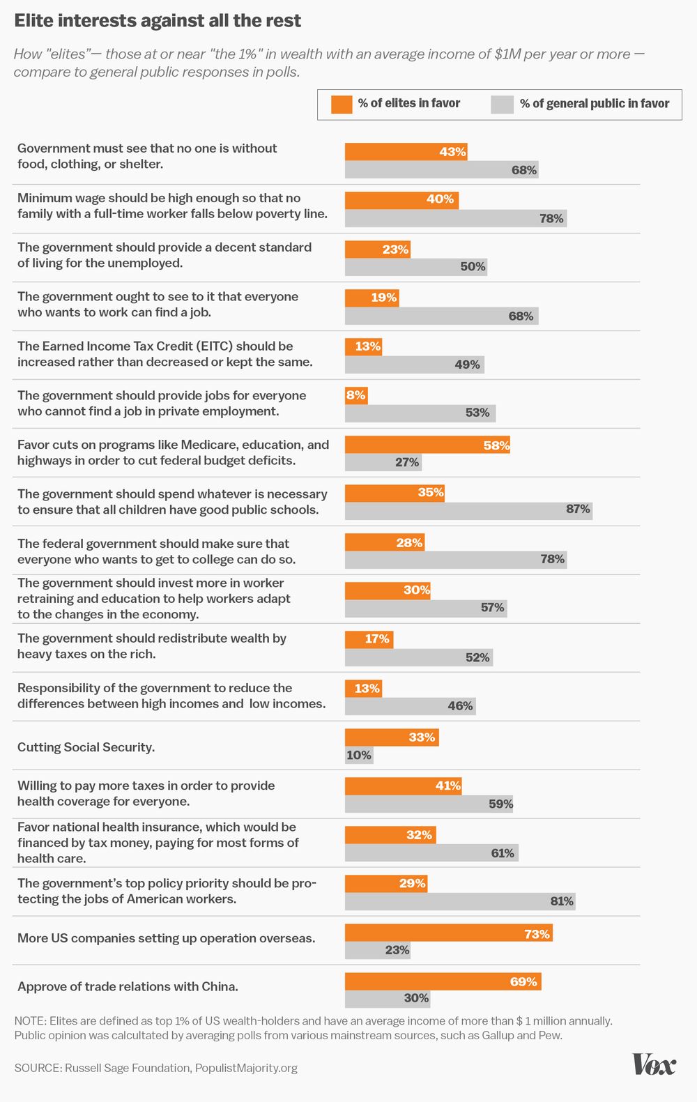 Today elite opinion is diverging from mass opinion and I am less sanguine about whether US elites will create policies that help the interests of American workers. Elites are much less dependent upon American workers in today’s more globalized era. Below are a couple of graphs from David Roberts and Javier Zarracina that show how different the top 1% are from the rest of us: