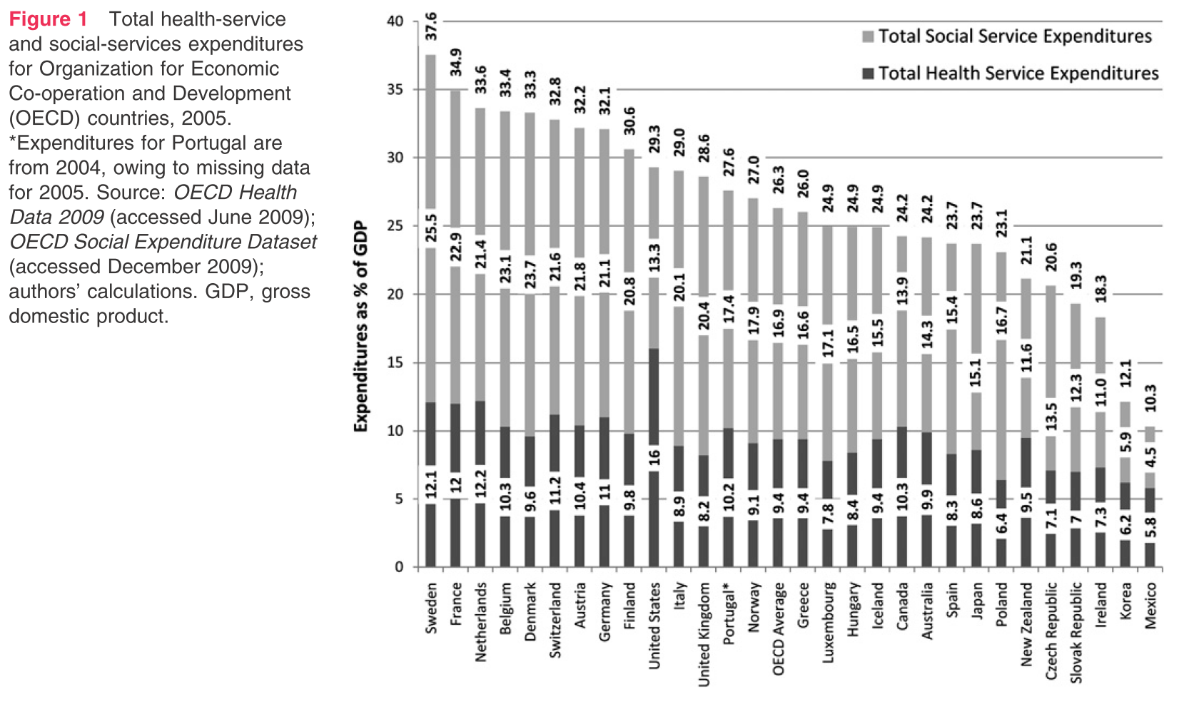The US spends only 92 cents on non-health social services per dollar of healthcare spending whereas the average in other OECD nations is more than $2. Bradley et al. argue that countries like the US should divert more expenditures away from healthcare towards