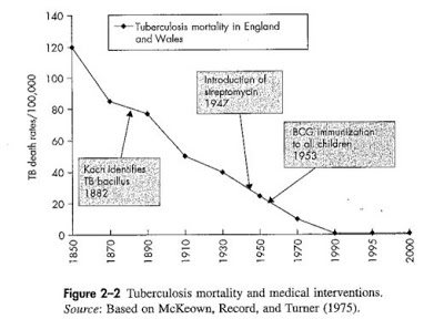 McKeown argued that it was not drugs, or vaccines, or scientific medicine which conquered this infectious disease, but money [and]… the crucial factor was improved nutrition – this became known as the McKeown Thesis. Many doctors, biologists and pharmacologists rejected this conclusion… In particular the historian Simon Szreter has done some meticulous work on statistics and death records, and suggested that sanitary measures, clean water and public health are the real causes of the decline in tuberculosis mortality (he’s also made it clear how political this process of interpretation can be…)