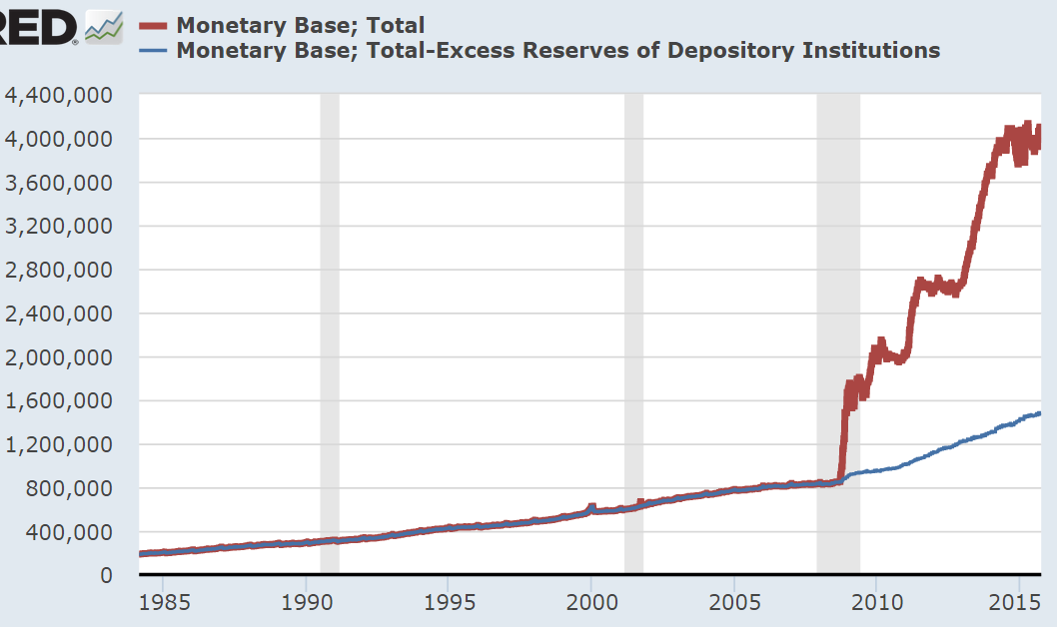 The monetary base is not money and economists understood that when they created the main statistics for measuring money: M1, M2, M3, and MZM. These are our best attempts to measure the money supply and none of them include any money that is hoarded in bank vaults because this is never part of the money supply. Banks never directly use any of it for buying anything, so it isn’t really money and it doesn’t have any direct effect on the real economy.