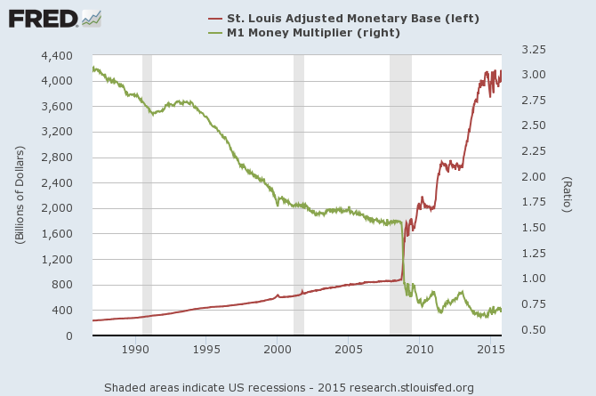 Bank reserves are often called “high-powered money” because it could be multiplied into large quantities of money if banks use their reserves to increase lending and get real money to real businesses and consumers. But “high-powered money” is a misnomer because it is not money. Bank reserves are never actually used to exchange goods and services and it is the goods and services that matter. It is just like seed corn can be multiplied into large amounts of food. But seed that is not multiplied into food has no power at all. Similarly, bank reserves can produce multiples of money if they are lent out to people who can use money, but the reserves themselves are never used just like seed corn is never eaten. If germination rates drop in half due to being stored too long, the power of seed-corn drops in half. Similarly the power of bank reserves solely depends upon whether it is used to make real money. The power of the monetary base (mostly bank reserves) is called its multiplier.