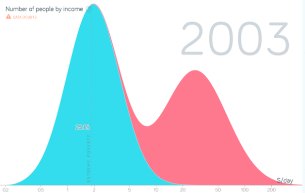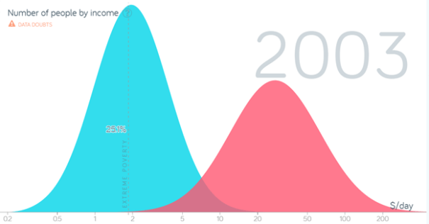 Richer countries usually have higher life expectancy, so it is amazing that Ukraine achieved much higher life expectancy despite much lower income. The best explanation for this conundrum is the fact that Ukraine had much lower inequality. The Gapminder graph below compares the 2003 income distribution in Ukraine (yellow) and South Africa (blue). Both nations had about the same population (45m) which means that the area under each curve is identical, but South Africa’s income was much more spread out due to much higher inequality. Thus, South Africa had a much bigger problem with extreme poverty, defined as earning less than $1.85 per day despite having a much higher mean income.