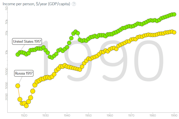 This graph shows the best measure of economic prosperity that we have, GDP/capita, on the vertical axis. It is in log scale because that represents the relative progress between the two nations as the size of the gap between the two lines. The gap narrowed from 1920 until 1939 because Russian growth was faster than US growth until WWII when Russian GDP was artificially suppressed by wartime destruction whereas US GDP was artificially boosted by government production and the gap widened. WWII was so horrific in Russia that life expectancy dropped to under 16 years which is much worse than conditions on the western front to say nothing of in the US. US life expectancy actually rose during WWII, perhaps in part because massive wartime spending finally helped the economy recover completely from the Great Depression. After WWII the economic gap between the US and Russia dramatically narrowed as life normalized in the later half of the 1940s and Russia again grew faster than the US. Overall, average Russian growth was faster than US growth until sometime in the 1970s when Russian growth stagnated and the slope of the yellow line levels off.