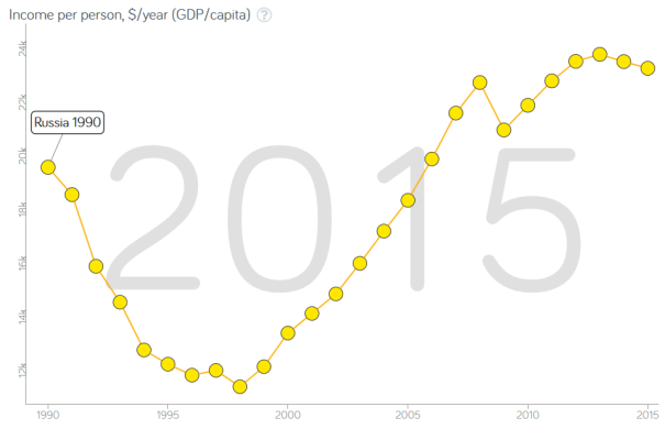 The communist nations of East Asia were not successful economically, but even so, they succeeded militarily in fighting the combined weight of the US and allies to stalemate in Korea and then succeeded in driving the US out of Vietnam. In the 1980s, President Ronald Reagan was convinced that the USSR had surpassed America in military might. Ironically, the USSR’s economy had been stalling at that point and their military was stagnating, but Americans believed Reagan’s fears that the USSR military was ahead of the US and cold war movies like Firefox (1982), The Day After (1983), and Red Dawn (1984) are good illustrations of popular sentiment during the Reagan era. The last big cold-war movie in this genre was The Hunt for Red October which was released in 1990, after the USSR was already disintegrating, but even then Soviet supremacy still felt real enough to make it a blockbuster. To modern eyes, the movie looks like a strange alternate reality because we tend to remember the USSR as a basket case whereas the communists were portrayed in the movie as being terrifyingly super powerful. Although the USSR was already stagnating in the 1980s, the Russian economy did not collapse until the transition to capitalism from 1990 until 1998 as you can see in the Gapminder graph below. Russia didn’t even recover the economic prosperity it had at its peak under communism in 1989 until 2007 and much of that was due to the rise in energy prices bringing it prosperity as one of the world’s biggest oil and gas exporters. Lower oil prices since then (and economic sanctions against its military adventures in Ukraine) have produced another round of economic stagnation since 2008.