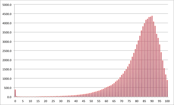 Numbers of women expected to die at each age, out of 100,000 born, assuming mortality rates stay the same as 2010-2012. The expectation is 83, median 86, the most likely value (mode) is 90.
