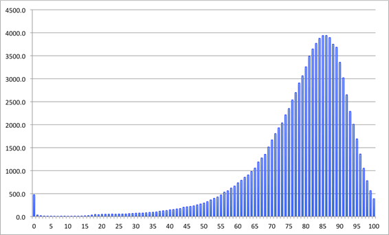 This can be clearly shown by looking at the life tables published by the Office for National Statistics (ONS) …[with] the expected number of deaths at each age out of 100,000 births, assuming the current mortality rates continue. The density plots for women and men are shown below, using the life tables for 2010-2012. The distributions have a small peak for babies dying in the first year of life, and then a long left-tail for early deaths, and then a sharp peak and a rapid fall up to age 100. The ‘compression’ of mortality is clear.