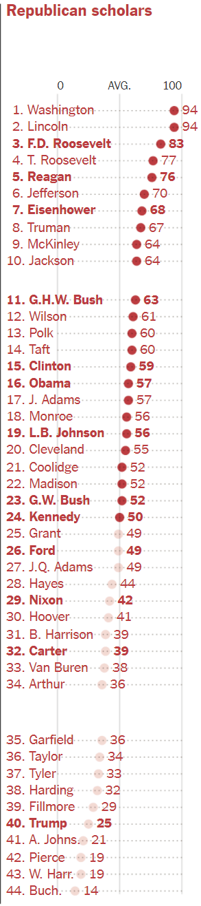 The New York Times surveyed 170 members of the American Political Science Association’s Presidents and Executive Politics section to rank all American presidents and they placed Trump dead last. Of course, if we just look at the scholars who are Republicans, their rankings are different from the rankings of Democrats and independents, but they too ranked Trump near the bottom. They put him at the fifth worst president in history. That is despite the fact that scholars have a tendency to rank recent presidents much higher than presidents from long ago. For example, Six out of 14 postwar presidents make their top 10. Note that list shown here is just the Republican ranking which just includes three postwar presidents (highlighted in bold) in their top ten.