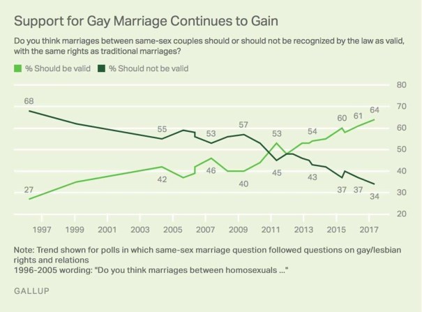 Whereas in 2009 nearly 50% more Americans opposed gay marriage than supported it, as of the latest poll, a mere eight years later, there are nearly twice as many Americans who support gay marriage than those opposed according to Gallop.