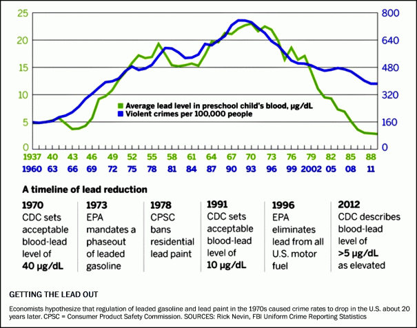 Even worse than the aesthetic effects of pollution were its direct effects upon the brains of people who lived in dense urban areas. Lead pollution, primarily from automobile exhaust, was a potent neurotoxin that created a crime wave by warping the brains of people exposed to it. Lead exposure during infancy makes people stupid and violent and reduces impulse control which causes all sorts of problems when kids grow up. Lead was worst in densely populated urban areas, so the crime wave was worst in those areas. When lead emissions were banned, the crime rate fell the most in urban areas too. The reduction in pollution has led to an urban renaissance in cities across America as urban areas have become desirable again. Here is a graph of the correlation between blood lead levels and violent crimes from Kevin Drum at Mother Jones. The violent crime rate increased by about 380% from 1960 to its peak in the 1990s.