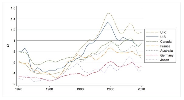 You can see this in the evolution of a ratio known as Tobin’s Q — the value of all the shares of stock outstanding divided by the book value of everything publicly traded companies own.