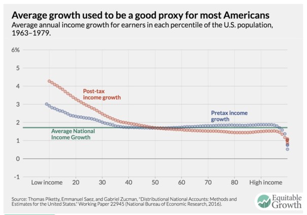 GDP is a measure of total income in a country. For at least the two decades before 1980, American median income grew about as fast as GDP and Americans below the median income saw faster growth than Americans who were richer than the median. Income growth was broadly shared and no class of Americans got poorer. The following graphs show the growth rate across the income distribution for all Americans. The median income had real growth of about 1.7% annually in the 1960s and 1970s which was also the growth rate of mean GDP (the green horizontal line).