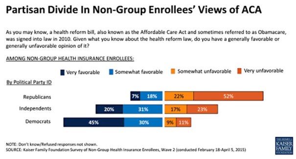 A 2015 poll found that 25% of Republicans were favorable towards Obamacare whereas 75% of Democrats were favorable.