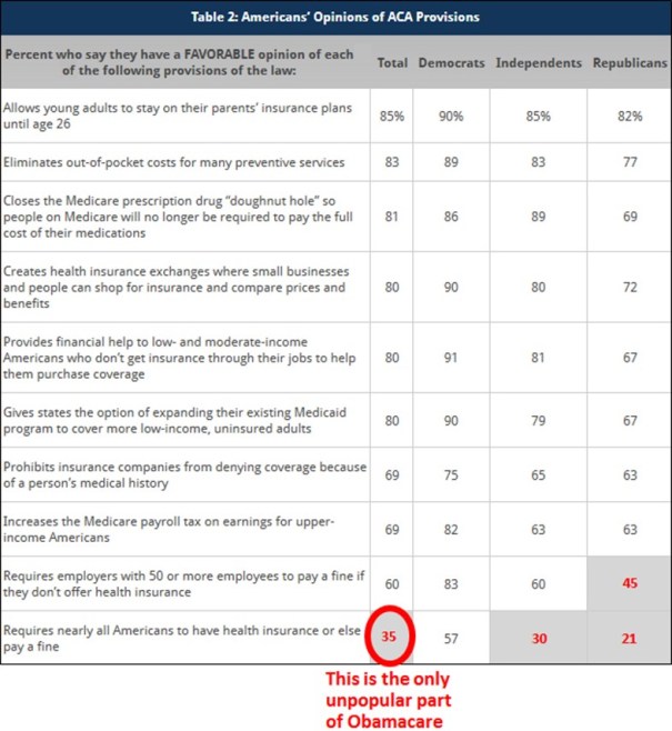 Similarly, if you ask Americans about whether they approve of the main things Obamacare does, they like nearly everything in the bill. Here is a Kaiser tracking poll from the end of 2016 with the graphic modified by Kevin Drum. Every part of Obamacare was very popular except the individual mandate:
