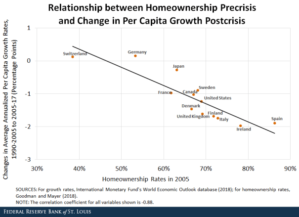 The St. Louis Fed produced the above graph showing that nations with higher homeownership rates were hit harder by the 2007 financial crisis and are still dealing with greater aftereffects today. Nations with the most rental properties like Switzerland and Germany have grown faster after the financial crisis than they did before. Nations with the highest homeownership like Ireland and Spain saw the biggest drop off in economic growth.