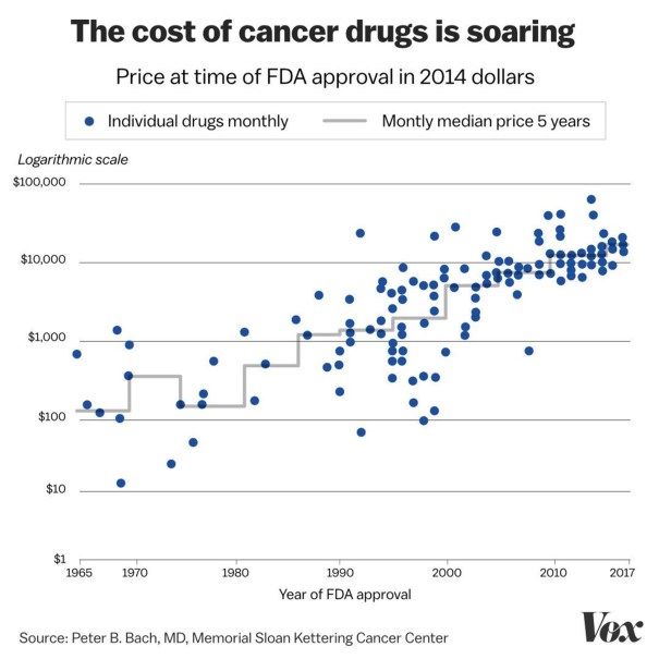 Getting a cancer immunotherapy treatment costs more than a house in many cities in the US, more than putting a few kids through private college. The average cost of cancer drugs has increased from $50,000 per patient in the mid-1990s to $250,000 today. That’s four times the median US household annual income.