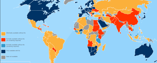 Birth control pills are available without a prescription in most countries of the world. Generally most (but not all) rich countries require a prescription as denoted by dark blue on the map and most (but not all) poor and middle-income nations do not as denoted by the other colors.
