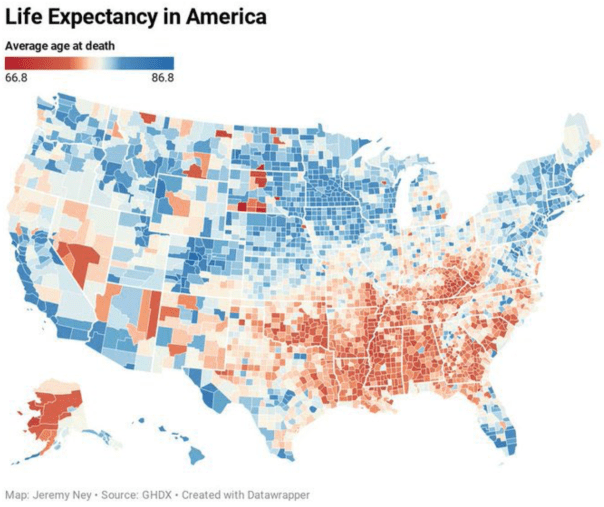 It is hard to claim that there is equal opportunity in America when there is a gap of over 20 years in life expectancy between counties in the US.