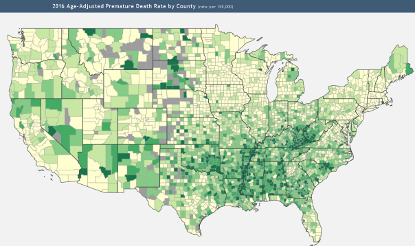 Whereas most people think of country living as being healthier than stressful city life, country music famously describes the misery of country life and the statistics agree.  Life expectancy is lagging more in rural areas and progressing in urban areas. The following map shows premature mortality which is worse in the darker counties.