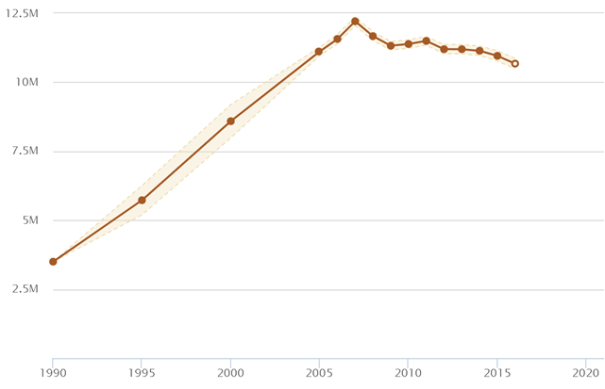 At about the same time as international trade has started falling, immigration also fallen. Immigration to the US peaked over a decade ago in 2007. Here is Pew’s data for the total number of unauthorized immigrants in the US.