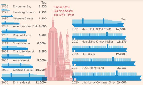 Because containers ships are can be loaded and unloaded about 97% faster, and make it easy to stack much higher, they have enabled ships to grow in size so that modern container ships are over 20 times larger than the typical ship of the 1950s, and larger ships are more fuel efficient and labor efficient. The biggest container ships are now as big as the Empire State Building and they are so big that they would require a train that is 90 miles long to carry all 24,000 of their 20ft containers.