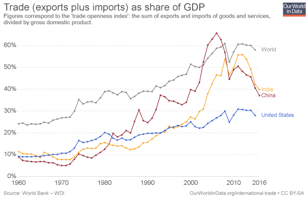 This is still going on, but the major opening of Latin America, China, and India is already well behind us. …The point is that it’s entirely reasonable to believe that the big factors driving globalization were one-time changes that are receding in the rear-view mirror, so that we should expect the share of trade in GDP to plateau — and that this doesn’t represent any kind of problem. In fact, it’s conceivable that things like rising fuel costs and automation (which makes labor costs less central) will lead to some “reshoring” of manufacturing to advanced countries, and a corresponding decline in the trade share. Ever-growing trade relative to GDP isn’t a natural law, it’s just something that happened to result from the policies and technologies of the past few generations. We should be neither amazed nor disturbed if it stops happening.