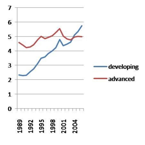 Below is a graph of US imports of manufactured goods from developing countries as a percent of GDP that shows how rapidly the poor, developing nations expanded their share of US imports.