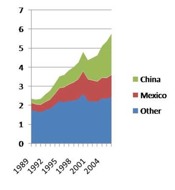 In 1989, the US imported twice as many manufactures from other rich countries as from poor countries, but imports from developing countries were growing extremely rapidly and by 2006, the US was importing more from developing countries. The big story that explains most of this change was the dramatic rise in imports from Mexico (partly due to NAFTA in 1994) and China as the following graph shows. This is the same as the developing country imports line in the above graph, but breaks it down into three sources.