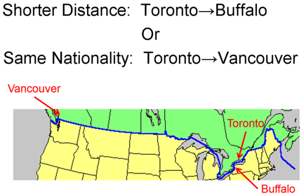 National borders matter a lot too. If not, then a firm in Toronto, Canada would do much more business with firms in nearby Buffalo, New York than with firms in Vancouver, Canada on the opposite side of the continent, but in reality Canadian firms prefer distant Canadian customers over nearby foreign customers.