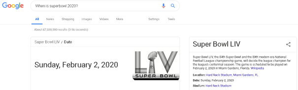 Every Google search is taking advantage of advanced artificial intelligence too. The other day my father-in-law was talking about how one of his friends never wanted to schedule future meetings on Superbowl Sunday and that got us thinking. If you wanted to know when the Superbowl would be held next year, how would you find out? Nowadays the answer is as easy as a Google search. Google’s artificial intelligence finds answers to questions.