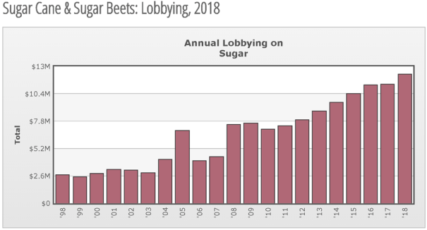 The sugar barons pay very close attention to US sugar policies because the sugar quota is the most important factor in determining their profits and they are willing to invest a couple percent of those ill-gotten gains in buying political influence. The Center for Responsive Politics maintains a database of lobbying expenditures from the Senate Office of Public Records. The big sugar companies documented spending over $12 million on lobbying in 2018.