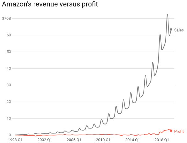 For most of Amazon’s history it made zero profit. That changed a couple years ago, but although its gross profit margin on revenues is now positive, it is still pretty negligible today.
