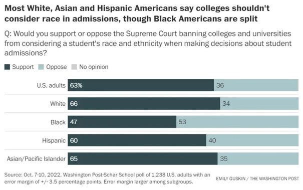 No wonder then that affirmative action isn’t even popular among it purported beneficiaries, African Americans & Hispanics. According to a recent Washington Post poll, 47% of African Americans would support the Supreme Court ban! Affirmative action only helps a few of the least needy African Americans who are already privileged relative to the vast majority of African Americans because they are in the top quarter of college-bound students. Affirmative action disproportionately benefits richer Blacks, some of whom could pass as white, and many of whom are foreign students or recent immigrants from elite African families. It is not something that most African Americans expect to benefit from.
