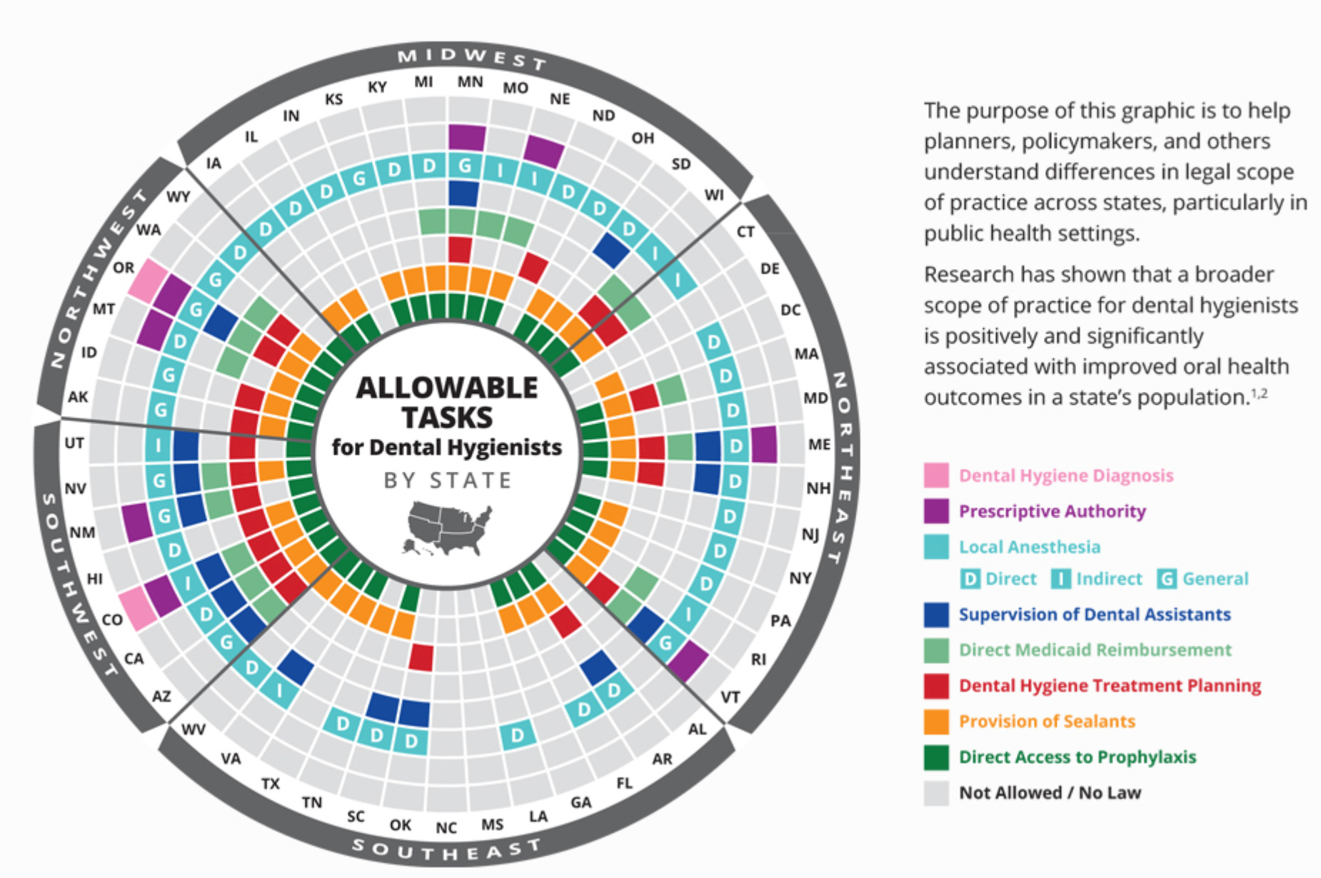 the form of dental care that most people need is a regular cleaning, and perhaps some x-rays just to check for problems. And if you’ve ever been to a dentist’s office, you’ve probably noticed that the dentist does not actually do this work and that it is done instead by a dental hygienist. One might think that since the work of a routine dental appointment is done by a hygienist rather than a dentist, a standard oral health appointment would simply be with a hygienist who lets you know if you need more specialized dental care. In reality, however, “scope of practice” rules pretty strictly limit which services a hygienist can provide, and only in Colorado and Oregon can hygienists perform diagnostic work…