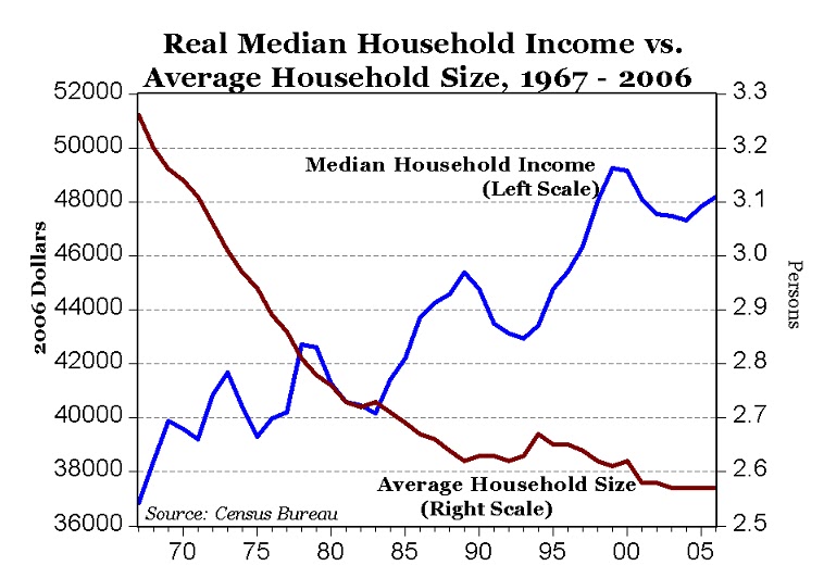 The composition of the median household also changes over time. For example, here is a graph from Mark J. Perry showing changes in average household size: