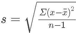 The sample standard deviation (s) is the total squared deviation from the population mean (x̄) divided by the sample size (n), and the sample size is reduced by one (n-1) because of there is more uncertainty in this equation since it is just a sample and not the population :