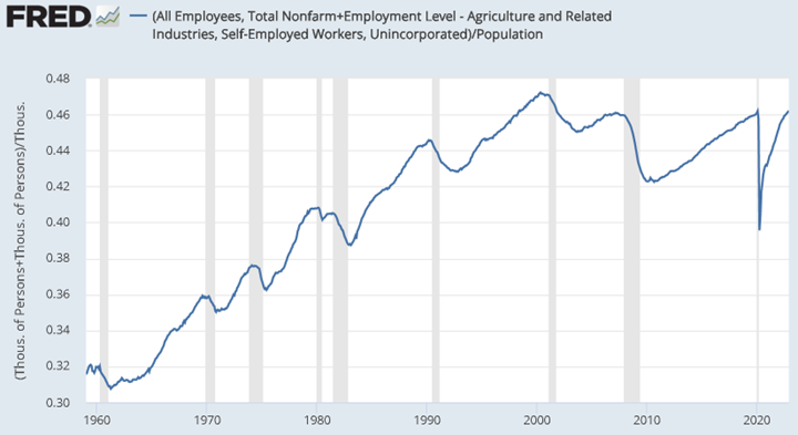 And it may seem odd to have a model economy where someone doesn’t work at all, but in fact, there has probably never been any time in American history when a majority of Americans were employed (for pay) because the majority of Americans have always been either stay-at-home parents, children, students, retired, unemployed, disabled, imprisoned, and/or part the leisure class who does not work: