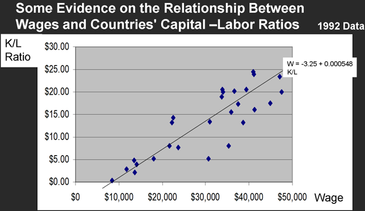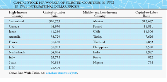 Remember that physical capital is a form of wealth. So by the definition of “wealthy,” wealthy countries have a lot of capital per person and poor countries do not. And countries with a lot of capital also tend to have higher wages because capital makes workers more productive and increases the demand for workers.
