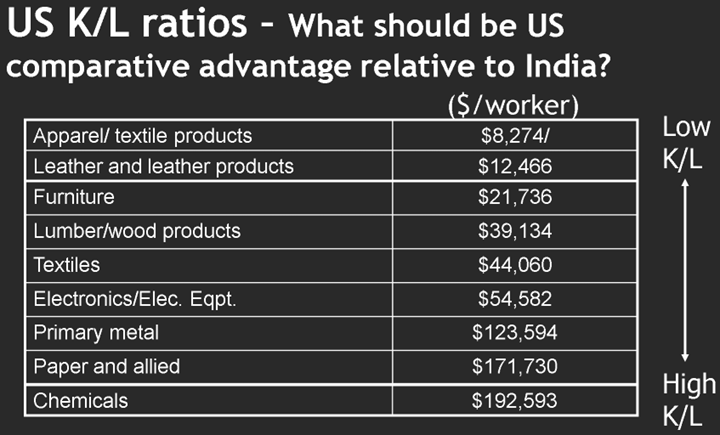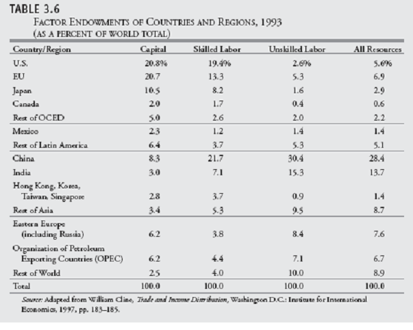The US was very capital abundant relative to the world in 1993 at 2.8% of capital/2.6% of unskilled labor, but the US was also very rich in human capital (“Skilled Labor) at 19.4% of the global total.